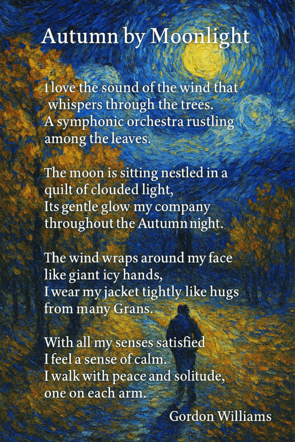 I love the sound of the wind that whispers through the trees. A symphonic orchestra rustling among the leaves. The moon is sitting nestled in a quilt of clouded light, Its gentle glow my company throughout the Autumn night…. Continue Reading →
