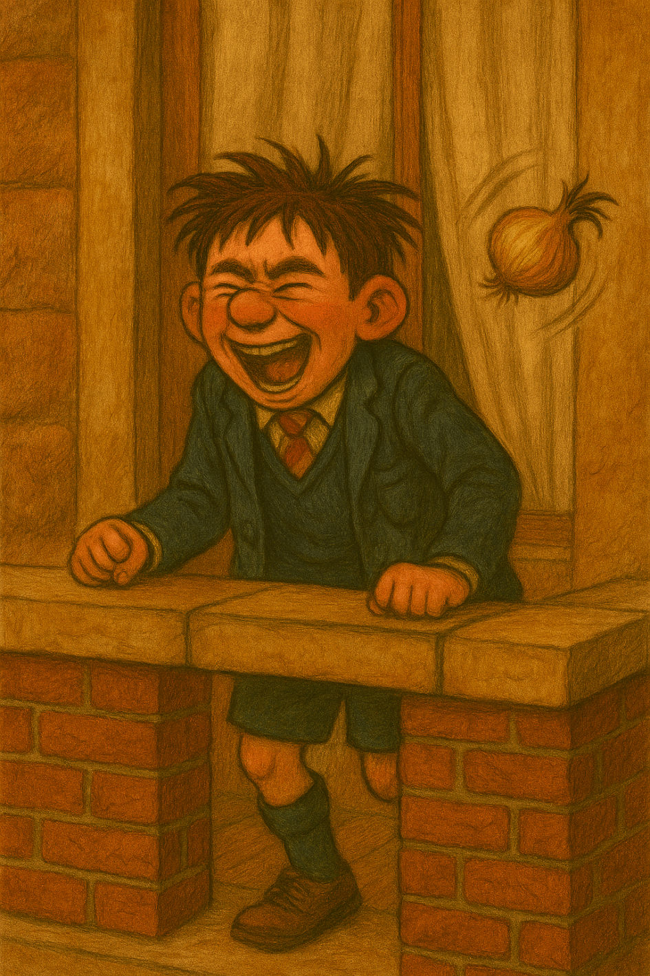 Holding the stalk, I began to swing my onion around my head like an Olympic hammer thrower, we laughed our heads off as I got faster and faster, suddenly the stem broke, the onion went flying and disappeared over some nearby bushes.