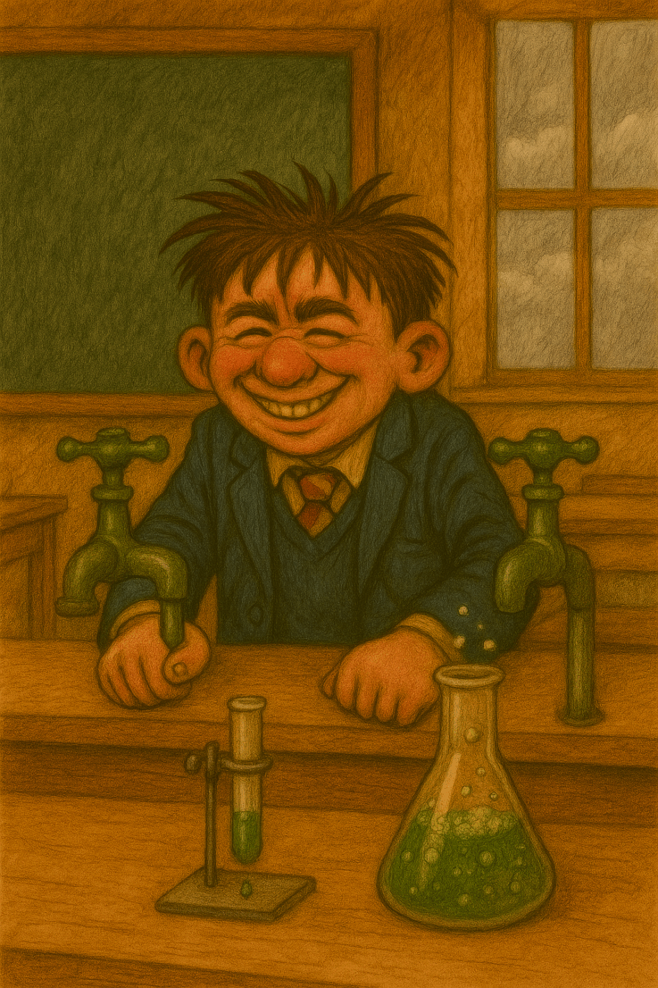 The door opens and Mrs Humes walks in “sorry I’m late class, I’m here now so let’s get started” she is standing right in the firing line, the battle inside me is over and with a flick of the wrists the taps are opened and two powerful jets of freezing water shoot across the classroom exploding onto her chest.